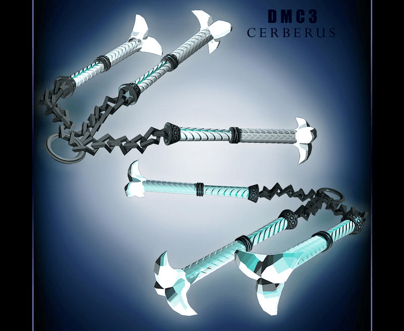 A set of nunchaku that allow Dante to utilize the power of ice for himself, it is a powerful Devil Arm that Dante used in his journey throughout the Temen-ni-gru. As it was made with the essence of the Cerberus clan, its powers over the cold should not be understated, as it was only destroyed by matching Balrog, who was amplified by a shard of Yamato after purposely training his power to defeat Argosax.