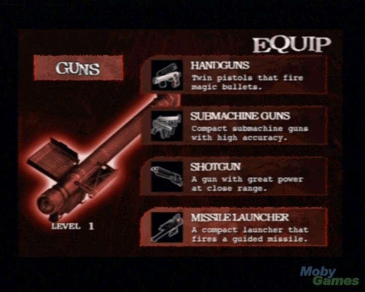 A high power Missile Launcher that fires slowly. Similar to the Grenade Launcher, but with missiles. While it has low accuracy and slow movement, it has absurdly high firepower, giving even greater crowd control. Besides, who says a Devil Hunter can’t have fun while on the job?