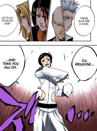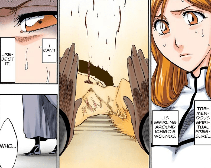 Yammy no-sold Loly’s corrosive poison – which could melt stone – through sheer resilience alone, with even weaker characters like beginning of series Ichigo being able to withstand acid that normally melts things with only minor burns. Ulquiorra’s Reiatsu was so powerful that Orihime struggled to negate a wound inflicted on Ichigo with her phenomena rejection, which works by denying, reversing, and rejecting phenomena, defying reality itself to undo and heal any damage done. Despite possessing such a powerful ability, Ulquiorra’s Reiatsu was able to defy her rejection ability, requiring her to break through the Reiatsu first before Ichigo could be healed. Later on, after Ulquiorra had entered Segunda Etapa, his Reiatsu had become so powerful that Orihime could not heal Ichigo at all.