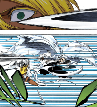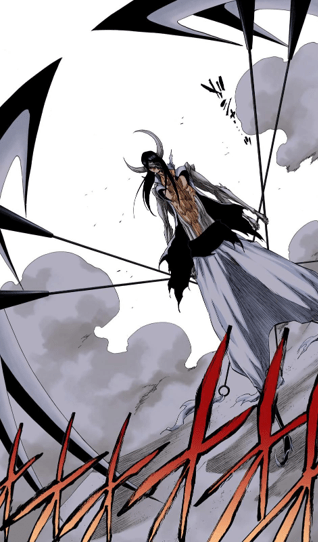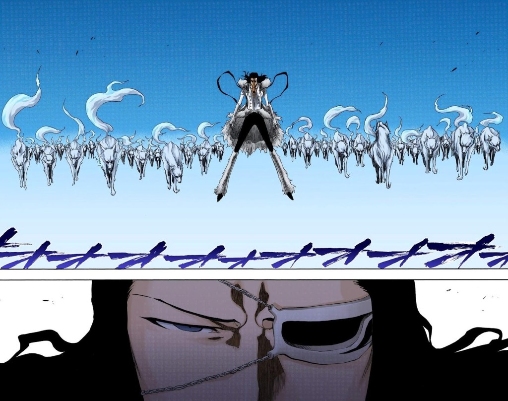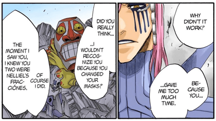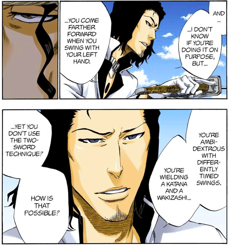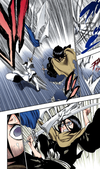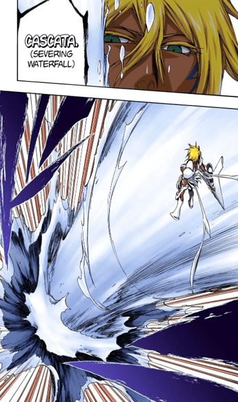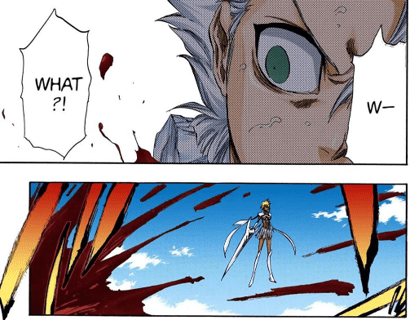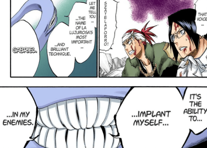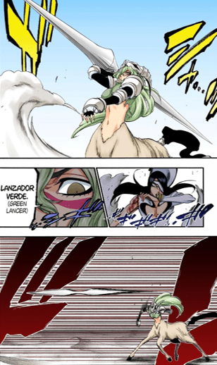 In the short time we are with Starrk we get to see he’s incredibly skilled. While most of his attacks consist of gunslinging and Cero spam, he was able to decipher many of his opponents abilities and tricks. As shown above he was able to identify Shunsui’s swords, sword style, and dominant hand (or hands in this case) by simply observing how he swung his sword. He does this multiple times throughout the fight: he was able to figure out Ukitake’s Shikai ability by just firing at him three times, and was able to work out how to play Iro Oni after just a single round. His ability to keep up with two Captains in the first place is an incredible testament to his skill and ability in combat.