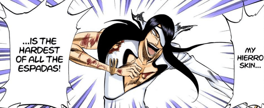 All Arrancar have hardened skin which acts as natural armor. Due to this, striking an Arrancar can injure the attacker for days. Their skin can prevent piercing weapons from penetrating them, and dampen a blade’s cutting ability