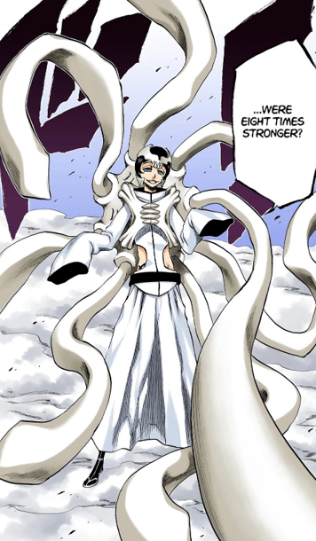 That said, Harribel was still in the upper echelon of the Espada, at minimum stronger than Nnoitra and likely at least comparable to Ulquiorra. She was able to fight Toshiro Hitsugaya for an extended time despite his prodigious skill as a Captain of the Soul Society, and was the only Espada who was not defeated in combat, instead being eliminated by Aizen out of disappointment in the Espada’s performance as a whole. It’s also worth acknowledging that her strength was great enough that Aizen’s first strike did not finish her off, requiring a second one to incapacitate her, and even that did not actually prove fatal.