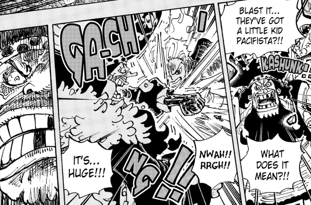 Among his repertoire are light-based laser beams replicated from Admiral Kizaru, with Kizaru having demonstrated that his are strong enough to pierce through an elderly Whitebeard. Kuma’s physical might is similarly impressive, being capable of clobbering St. Jaygarcia Saturn, one of the Five Elders. Though the Elders are able to withstand a lot of damage thanks to their immortality and regen, it’s worth noting that they were able to tank Sabo’s Fire Fist with no damage whatsoever, despite the fact that Sabo is Admiral level. In comparison, Kuma’s punch caused Saturn significant harm, requiring him to regenerate from it.